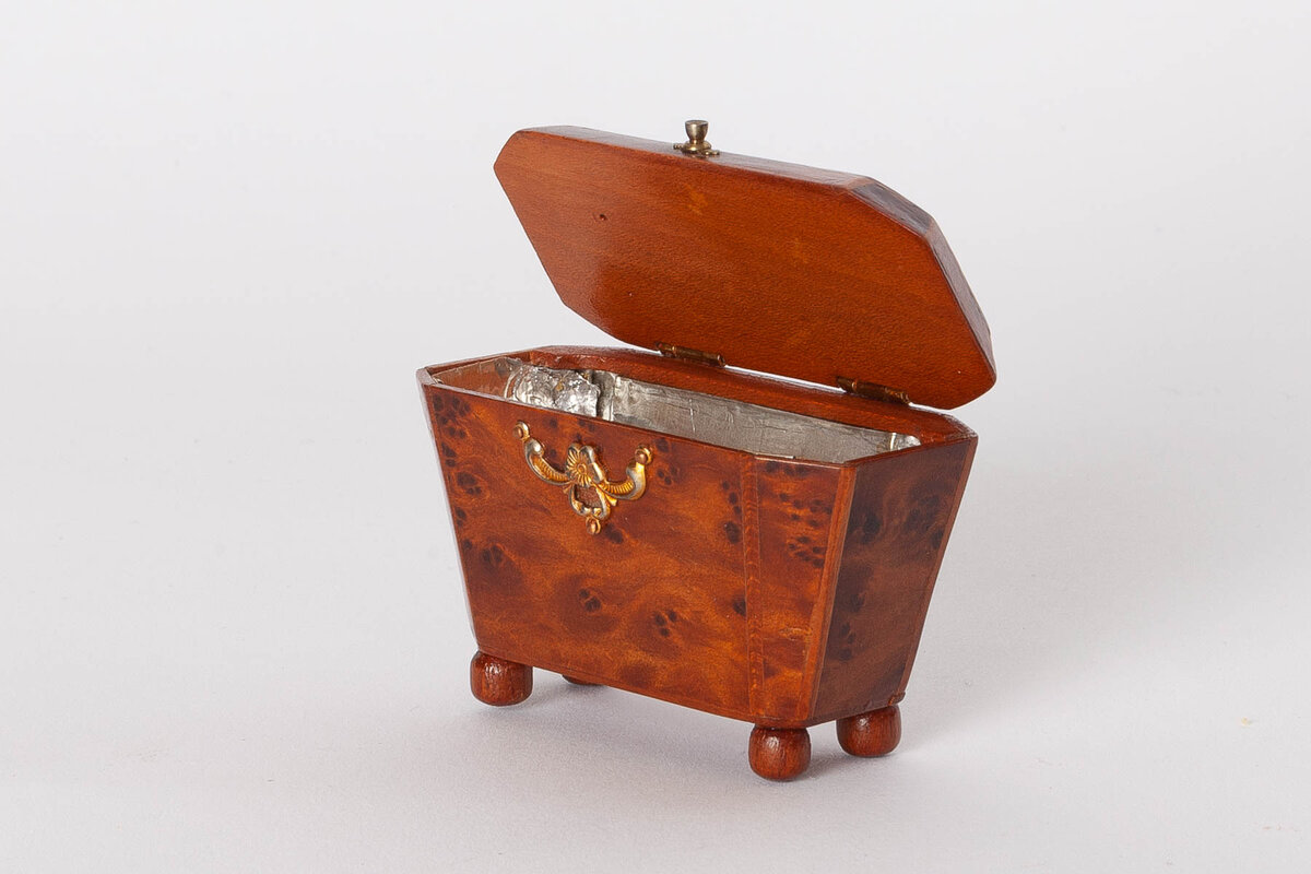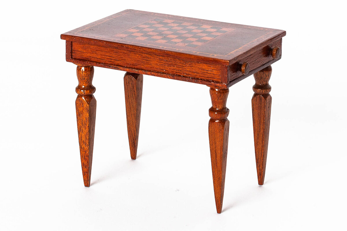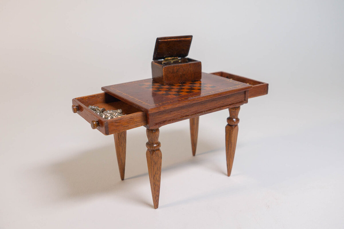 Schachtisch fourniert/eingelegt, Holzbehälter mit Figuren